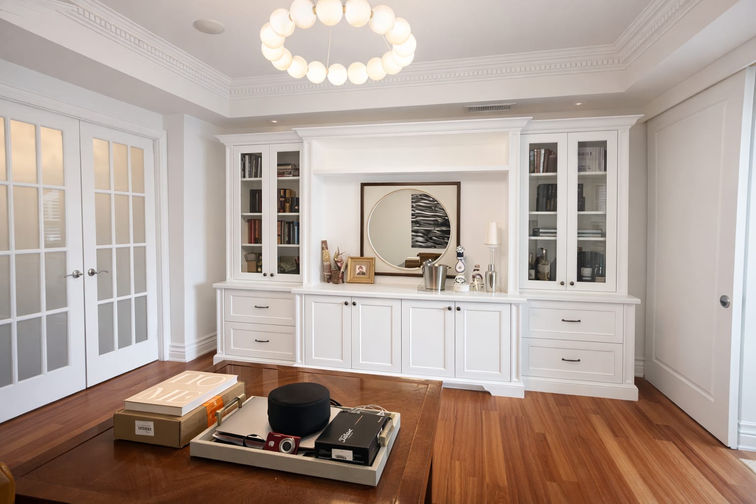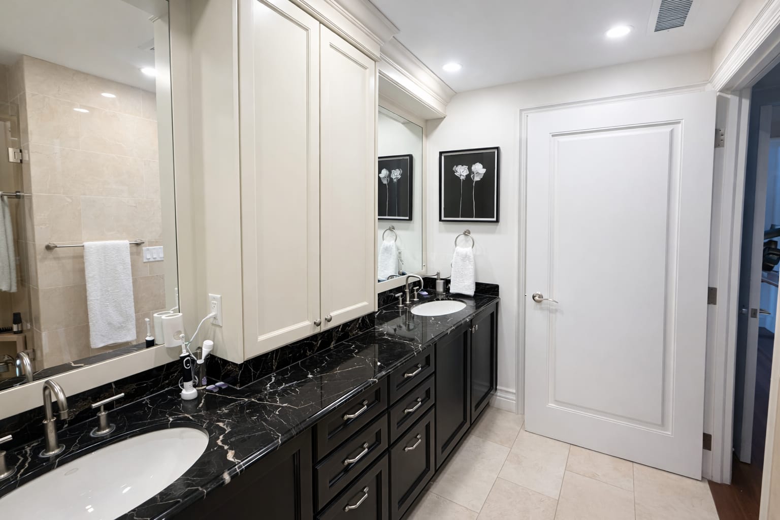 From the crisp white trim and flat-panel doors to the seamless wall surfaces, every line is clean and consistent. The contrast between light neutral walls and bold black feature elements demonstrates expert color control and flawless edge work.